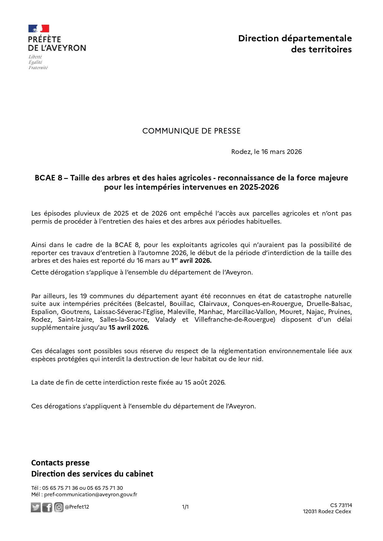 En raison des conditions hivernales particulières, une dérogation permet le report de la taille des arbres et des haies en Aveyron jusqu’au 1er avril 2026 voire jusqu’au 15 avril 2026 pour les 19 communes ayant été reconnues en état de catastrophe naturelle. ![]()